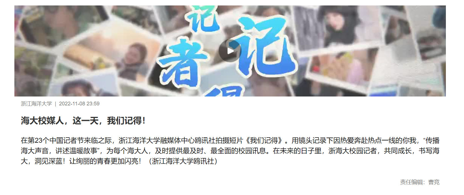 在第23个中国记者节来临之际,尊龙凯时首页融媒体中心鸥讯社拍摄短片《我们记得》。用镜头记录下因热爱奔赴热点一线的你我,“传播海大声音,讲述温暖故事”,为每个海大人,及时提供最及时、最全面的校园讯息。在未来的日子里,浙海大校园记者,共同成长,书写海大,洞见深蓝!让绚丽的青春更加闪亮!(尊龙凯时首页鸥...
