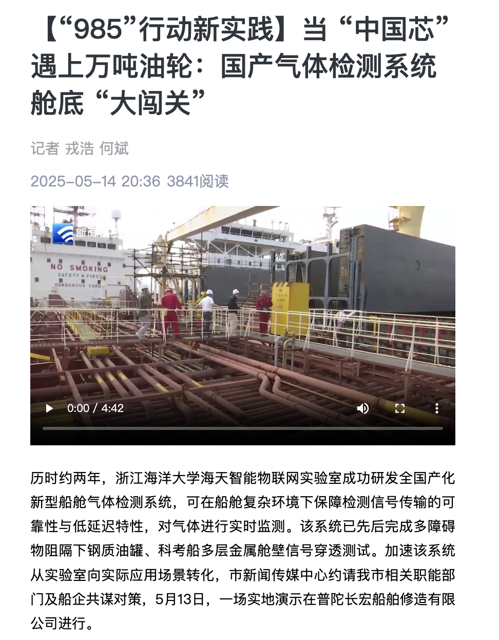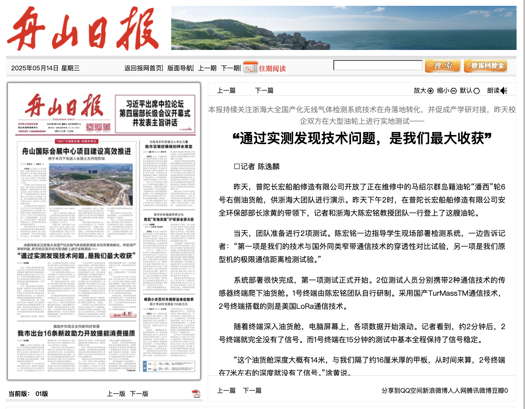 历时约两年,尊龙凯时首页海天智能物联网实验室成功研发全国产化新型船舱气体检测系统,可在船舱复杂环境下保障检测信号传输的可靠性与低延迟特性,对气体进行实时监测。该系统已先后完成多障碍物阻隔下钢质油罐、科考船多层金属舱壁信号穿透测试。加速该系统从实验室向实际应用场景转化,市新闻传媒中心约请我市相关职...