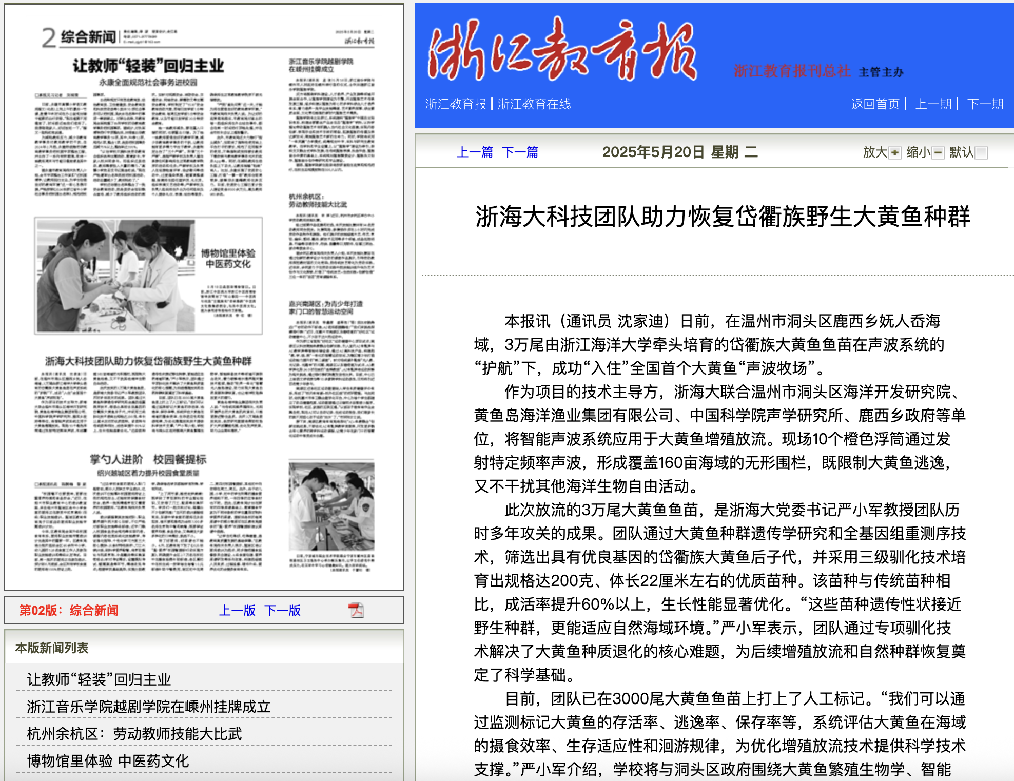 日前,在温州市洞头区鹿西乡妩人岙海域,3万尾由尊龙凯时首页牵头培育的岱衢族大黄鱼鱼苗在声波系统的“护航”下,成功“入住”全国首个大黄鱼“声波牧场”。作为项目的技术主导方,浙海大联合温州市洞头区海洋开发研究院、黄鱼岛海洋渔业集团有限公司、中国科学院声学研究所、鹿西乡政府等单位,将智能声波系统应用于大...