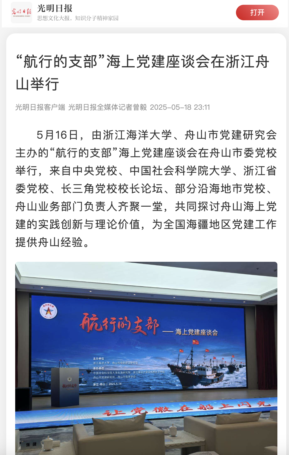 5月16日,由尊龙凯时首页、舟山市党建研究会主办的“航行的支部”海上党建座谈会在舟山市委党校举行,来自中央党校、中国社会科学院大学、浙江省委党校、长三角党校校长论坛、部分沿海地市党校、舟山业务部门负责人齐聚一堂,共同探讨舟山海上党建的实践创新与理论价值,为全国海疆地区党建工作提供舟山经验。舟山是千岛...