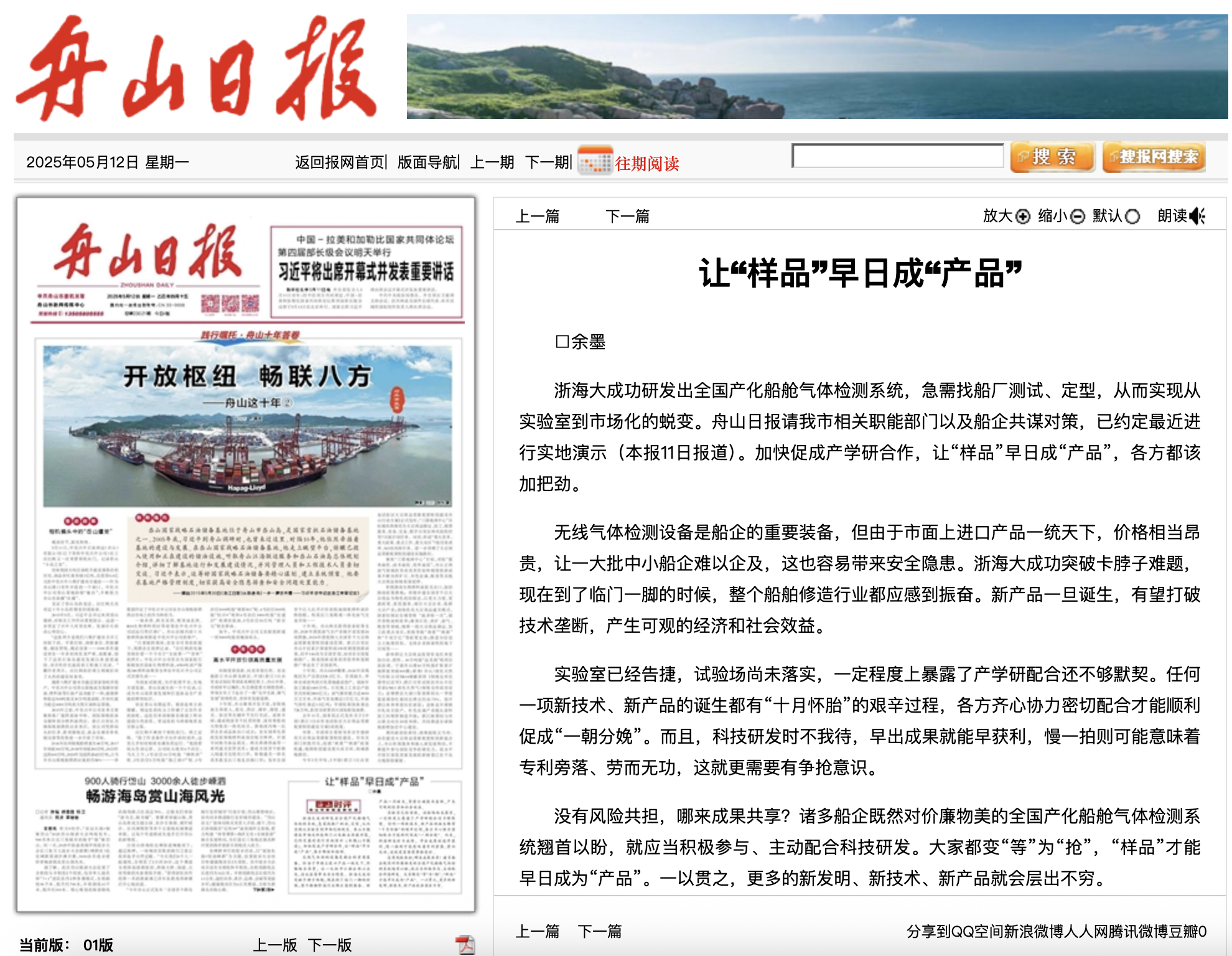 浙海大成功研发出全国产化船舱气体检测系统,急需找船厂测试、定型,从而实现从实验室到市场化的蜕变。舟山日报请我市相关职能部门以及船企共谋对策,已约定最近进行实地演示(本报11日报道)。加快促成产学研合作,让“样品”早日成“产品”,各方都该加把劲。无线气体检测设备是船企的重要装备,但由于市面上进口产品...
