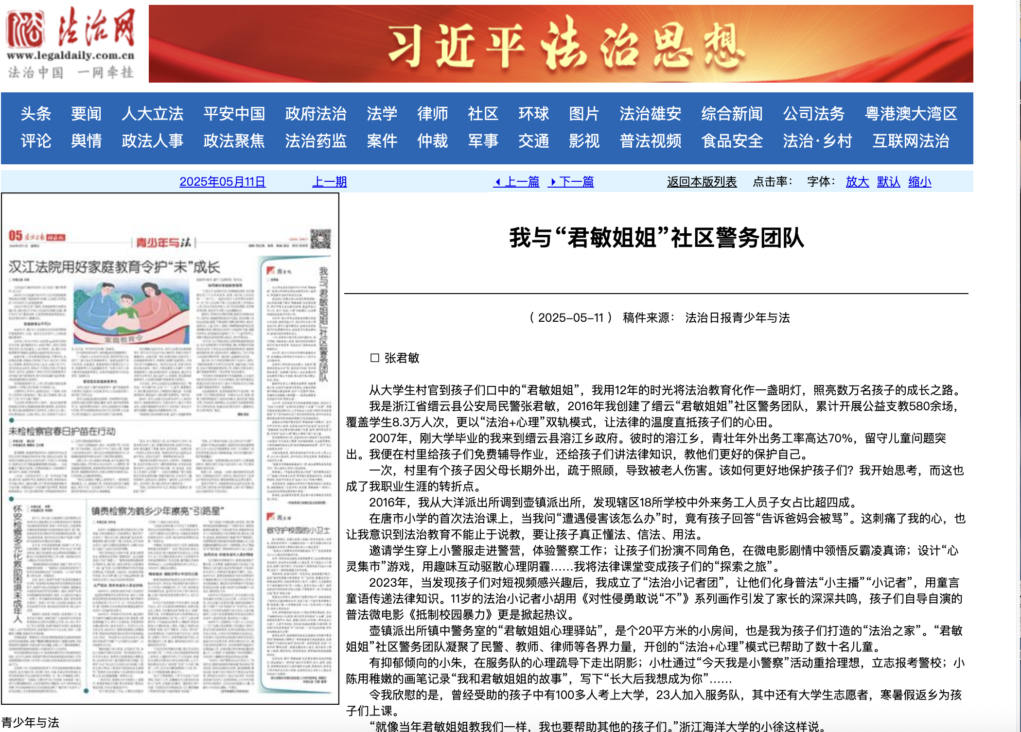 从大学生村官到孩子们口中的“君敏姐姐”,我用12年的时光将法治教育化作一盏明灯,照亮数万名孩子的成长之路。我是浙江省缙云县公安局民警张君敏,2016年我创建了缙云“君敏姐姐”社区警务团队,累计开展公益支教580余场,覆盖学生8.3万人次,更以“法治+心理”双轨模式,让法律的温度直抵孩子们的心田。2007年,刚大学...