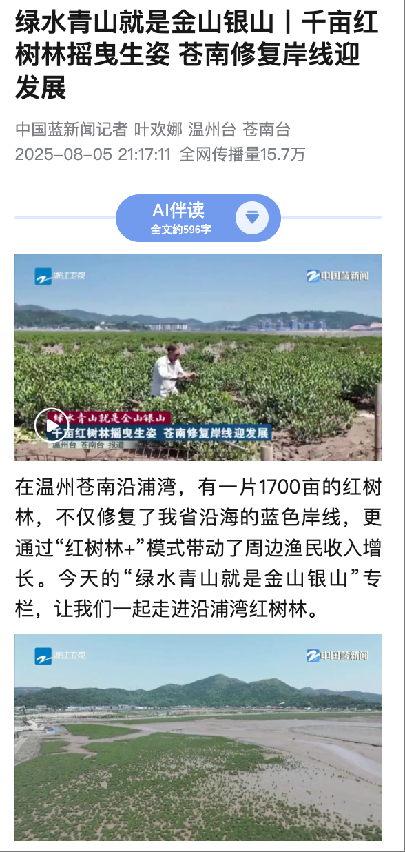 在温州苍南沿浦湾,有一片1700亩的红树林,不仅修复了我省沿海的蓝色岸线,更通过“红树林+”模式带动了周边渔民收入增长。今天的“绿水青山就是金山银山”专栏,让我们一起走进沿浦湾红树林。走进苍南县沿浦湾,这片全国面积最大的北缘红树林郁郁葱葱,每年可吸收封存二氧化碳约720吨。护林员林上刘从2017年开始在这里...