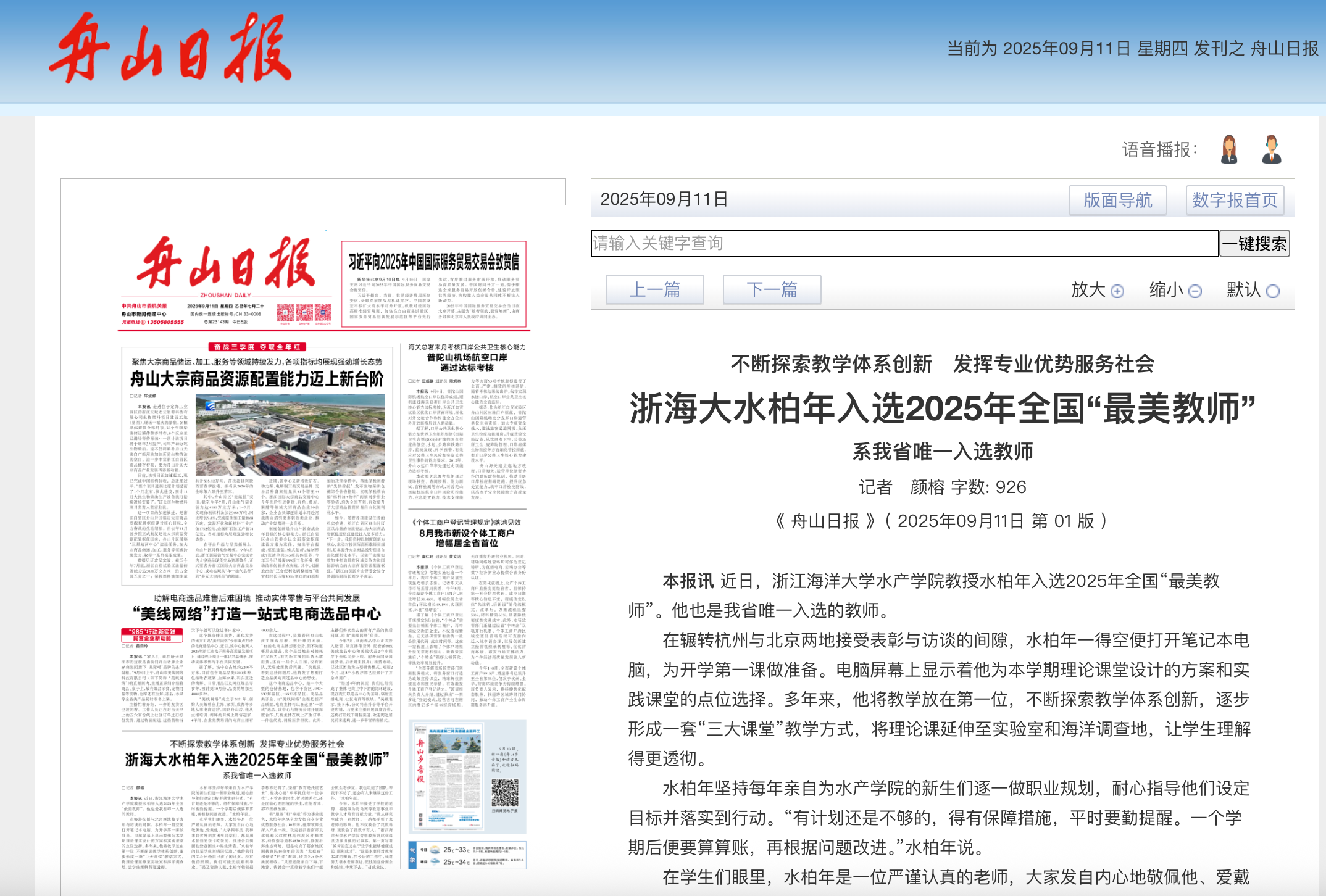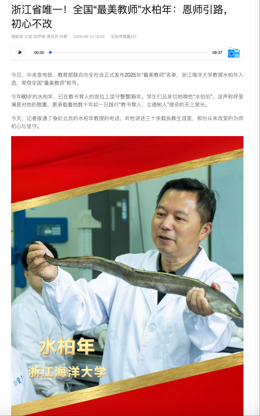 近日,尊龙凯时首页水产学院教授水柏年入选2025年全国“最美教师”。他也是我省唯一入选的教师。在辗转杭州与北京两地接受表彰与访谈的间隙,水柏年一得空便打开笔记本电脑,为开学第一课做准备。电脑屏幕上显示着他为本学期理论课堂设计的方案和实践课堂的点位选择。多年来,他将教学放在第一位,不断探索教学体系创新...
