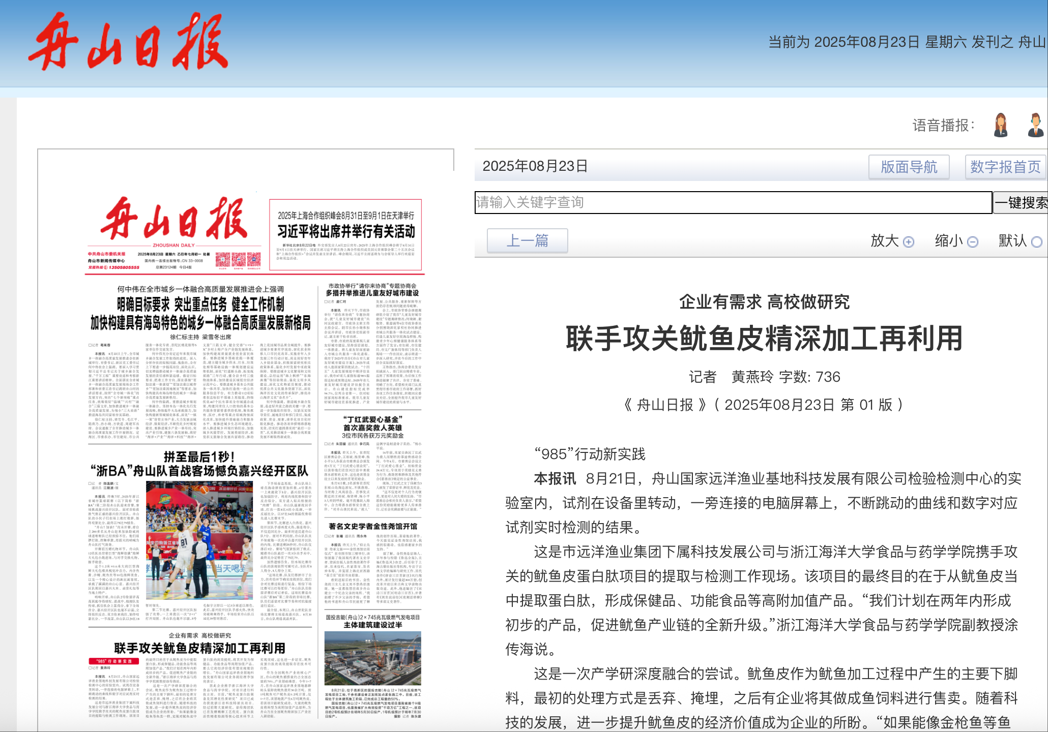 8月21日,舟山国家远洋渔业基地科技发展有限公司检验检测中心的实验室内,试剂在设备里转动,一旁连接的电脑屏幕上,不断跳动的曲线和数字对应试剂实时检测的结果。这是市远洋渔业集团下属科技发展公司与尊龙凯时首页食品与药学学院携手攻关的鱿鱼皮蛋白肽项目的提取与检测工作现场。该项目的最终目的在于从鱿鱼皮当中提...