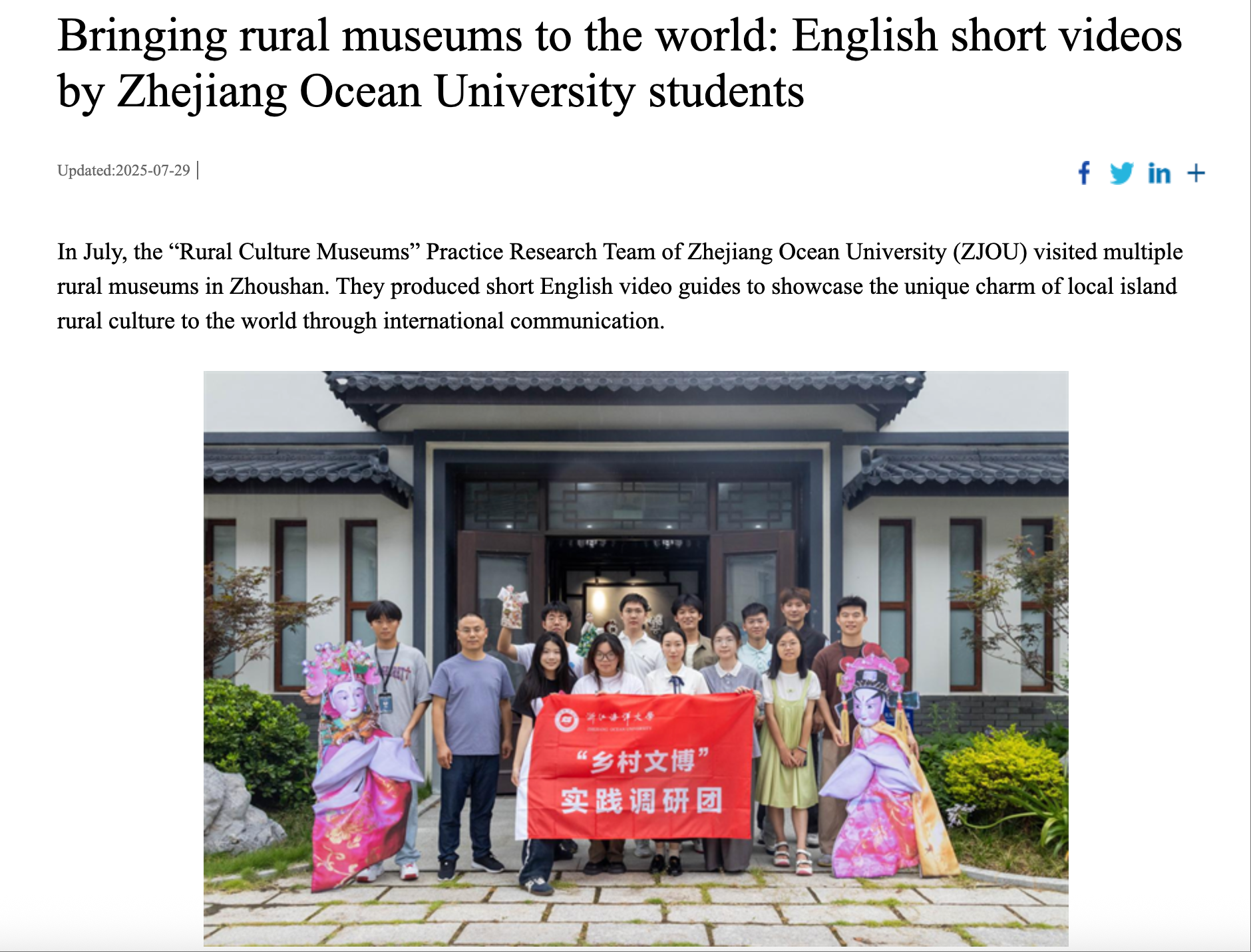 InJuly,the“RuralCultureMuseums”PracticeResearchTeamofZhejiangOceanUniversity(ZJOU)visitedmultipleruralmuseumsinZhoushan.TheyproducedshortEnglishvideoguidestoshowcasetheuniquecharmoflocalislandruralculturetotheworldthroughinternationalcommunication.OnJuly8,theteamvisitedthePuppetryExhibitionHall...