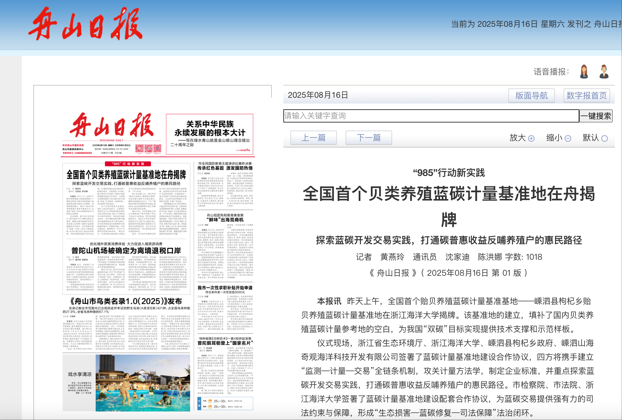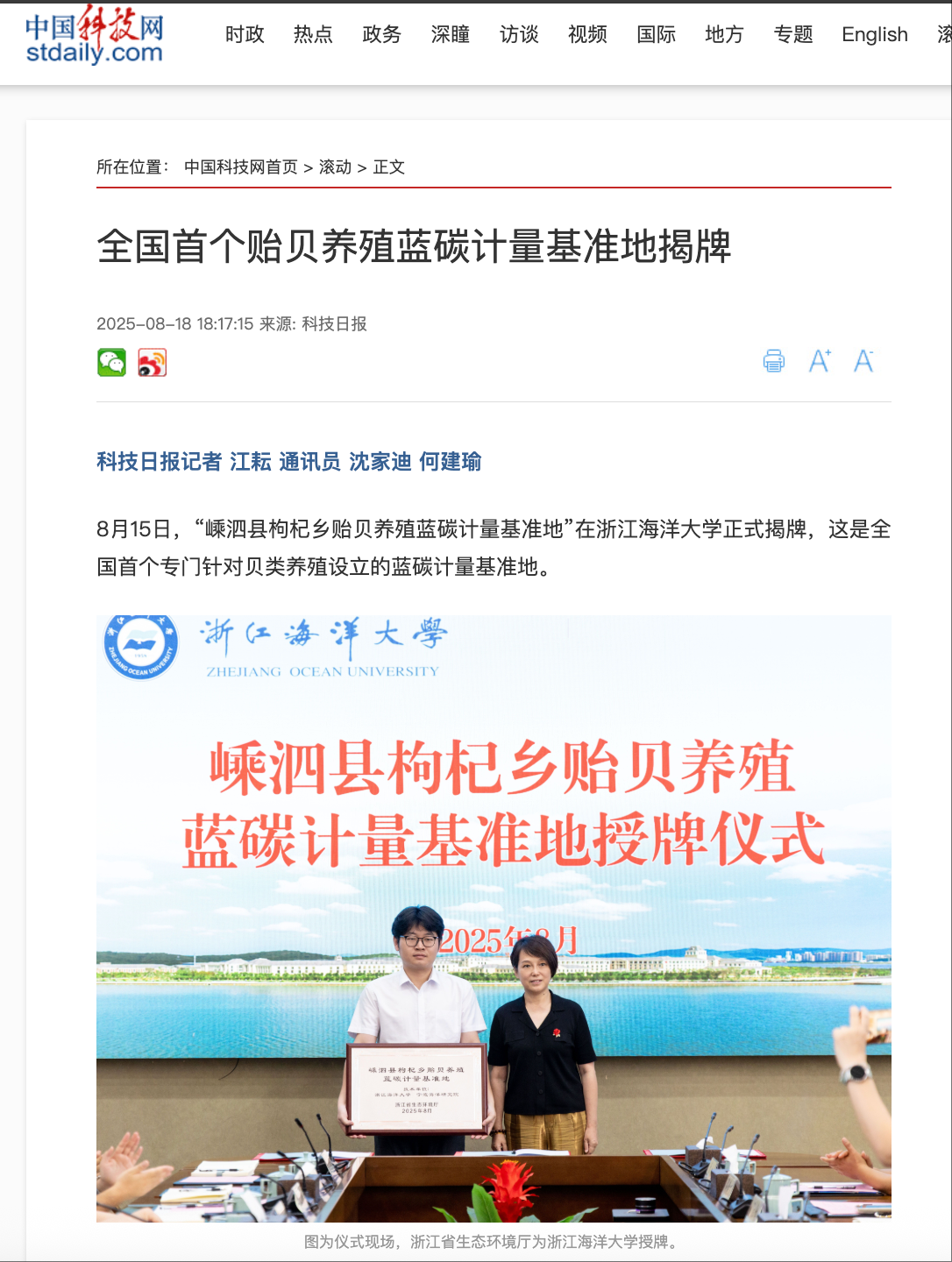 8月15日,“嵊泗县枸杞乡贻贝养殖蓝碳计量基准地”在尊龙凯时首页正式揭牌,这是全国首个专门针对贝类养殖设立的蓝碳计量基准地。浙江舟山嵊泗县是全国最大的厚壳贻贝养殖基地,被誉为“贻贝之乡”。2024年,嵊泗贻贝养殖总面积达3.14万亩,年产量24.73万吨,其中枸杞乡就占了2.23万亩。其成熟的筏式立体养殖模式、完善...