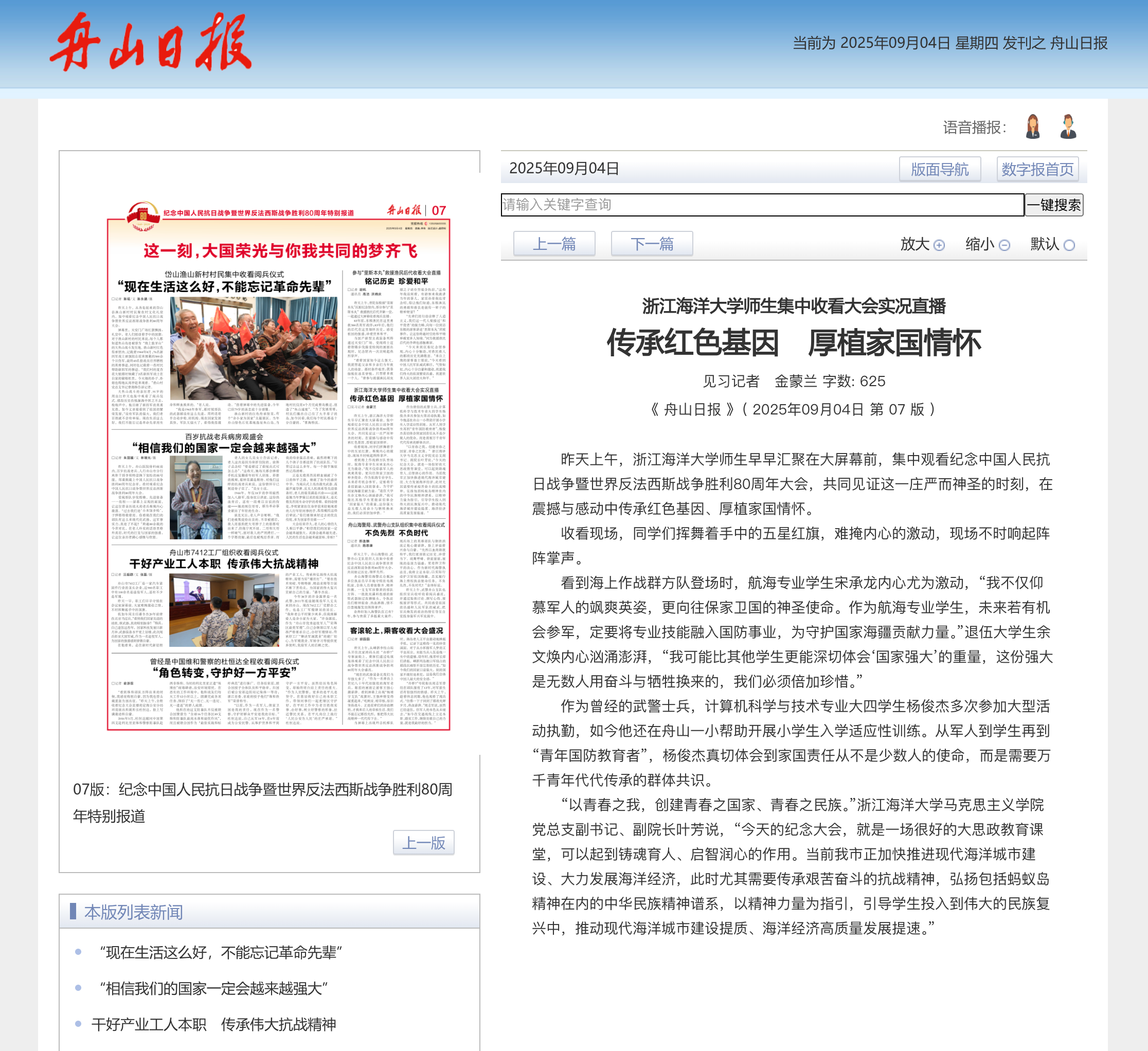 9月3日上午,尊龙凯时首页师生早早汇聚在大屏幕前,集中观看纪念中国人民抗日战争暨世界反法西斯战争胜利80周年大会,共同见证这一庄严而神圣的时刻,在震撼与感动中传承红色基因、厚植家国情怀。收看现场,同学们挥舞着手中的五星红旗,难掩内心的激动,现场不时响起阵阵掌声。看到海上作战群方队登场时,航海专业学生...