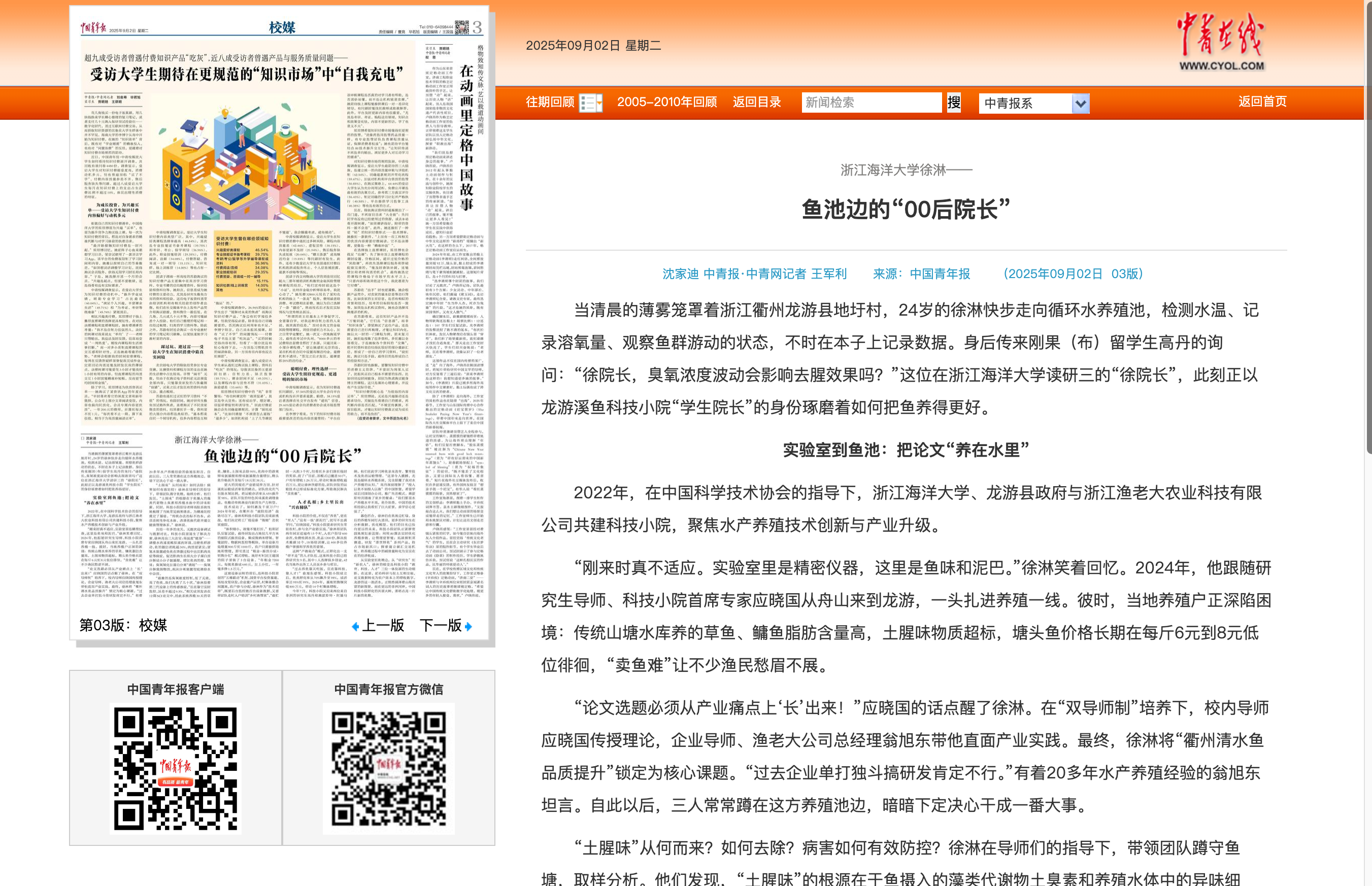 当清晨的薄雾笼罩着浙江衢州龙游县地圩村,24岁的徐淋快步走向循环水养殖池,检测水温、记录溶氧量、观察鱼群游动的状态,不时在本子上记录数据。身后传来刚果(布)留学生高丹的询问:“徐院长,臭氧浓度波动会影响去腥效果吗?”这位在尊龙凯时首页读研三的“徐院长”,此刻正以龙游溪鱼科技小院“学生院长”的身份琢...