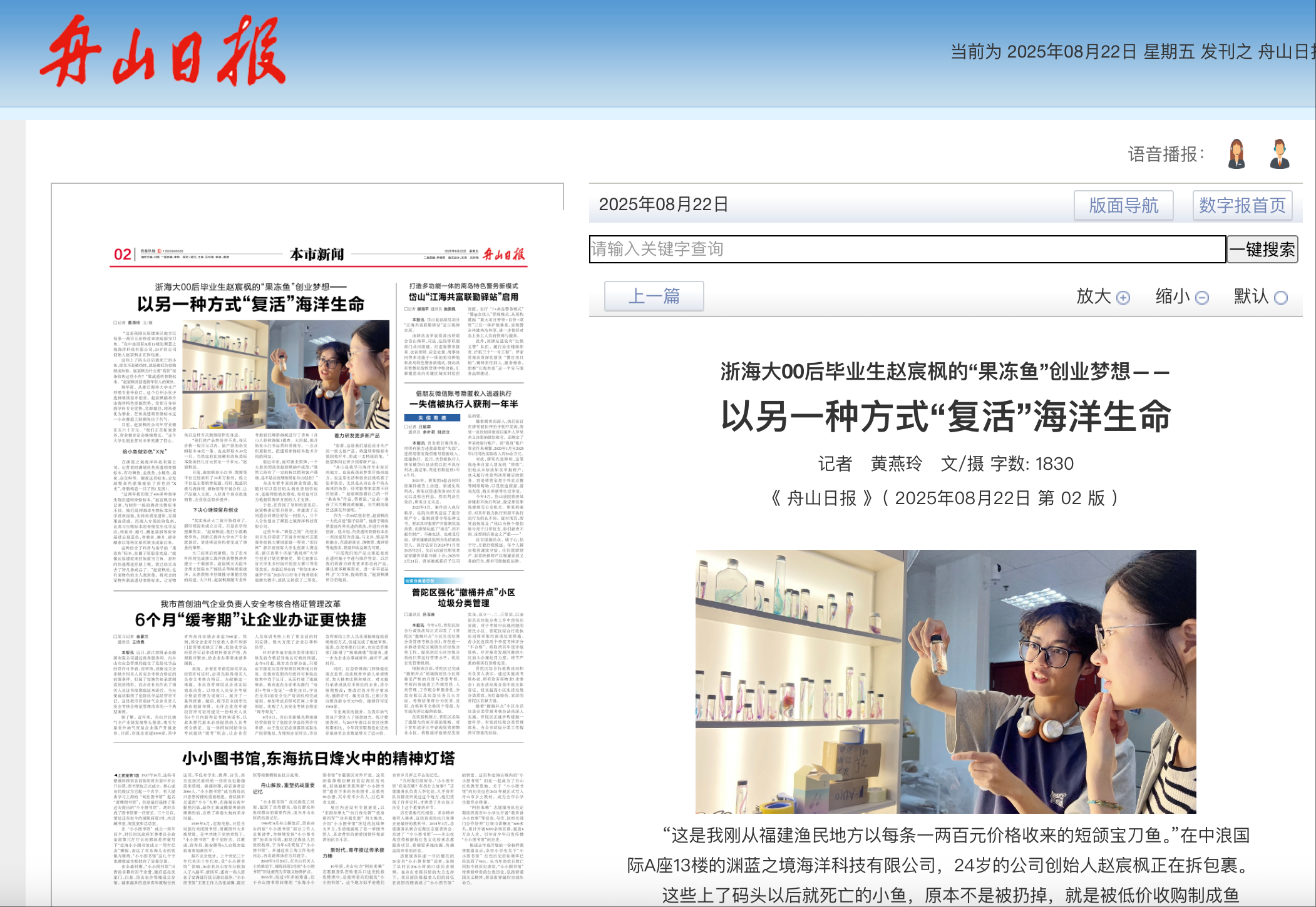 “这是我刚从福建渔民地方以每条一两百元价格收来的短颌宝刀鱼。”在中浪国际A座13楼的渊蓝之境海洋科技有限公司,24岁的公司创始人赵宸枫正在拆包裹。这些上了码头以后就死亡的小鱼,原本不是被扔掉,就是被低价收购制成鱼粉。赵宸枫为什么要“高价”按条收购这些小鱼?“做成透明骨骼标本。”赵宸枫说话透着年轻人的爽...